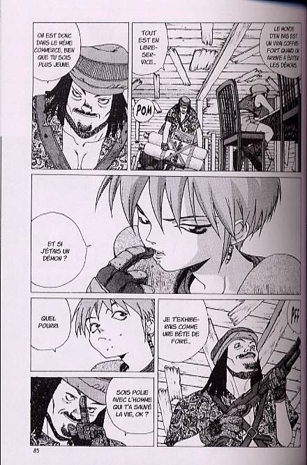 En revanche, il faudra supporter une rupture drastique entre le troisième et le quatrième tome, et malgré les bastons de plus en plus abusées et les concepts toujours plus nombreux, la tension ne reviendra jamais tout à fait ; on entre alors dans le pur affect. Soit on aime, et on continue, soit on n'aime pas, et on envoie proprement le reste se faire foutre. Il sera quand même plus facile d'aimer si on voit les messages subliminaux et si on a ses connaissances en MegaTen pour s'appuyer et comprendre le scénario qui est parfois un peu confus et pas toujours assez explicité au milieu des gunfights et autres bains de sang de plus en plus présent. Quelques chapitres de plus et une narration moins succincte des positions fondamentales n'auraient pas été de trop pour les moins cultivés des lecteurs.