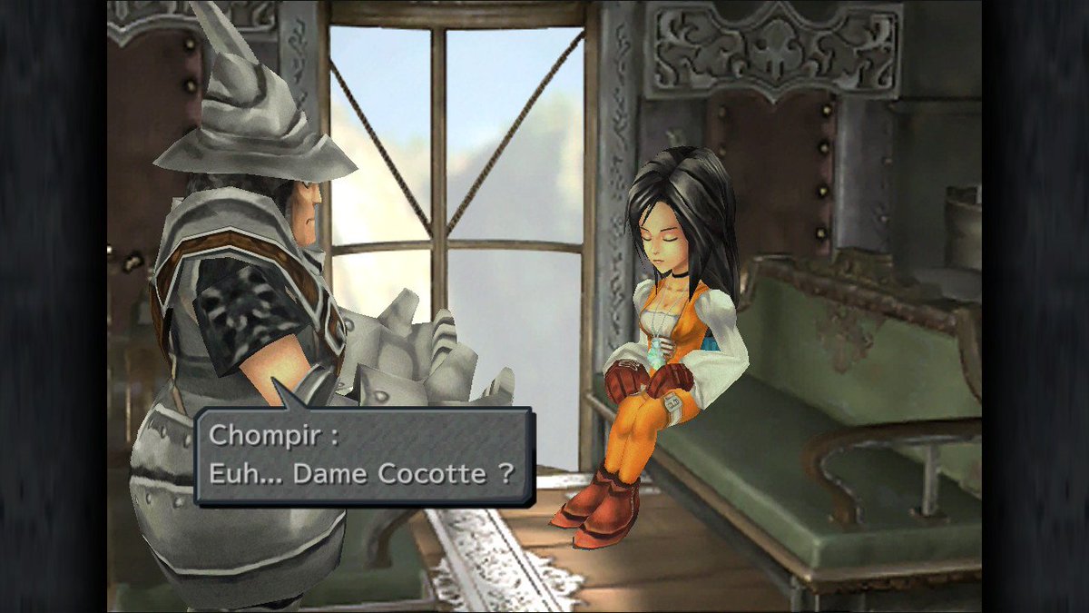 A la suite du Nintendo Direct, ils m'ont fait chaviré mon coeur avec l'annonce de la sortie de FF9 qui sort avant les autres puisqu'il était déjà disponible. Le soir-même le jeu était téléchargé et j'ai commencé une partie. Et j'ai décidé de renommé les personnages selon des membres de PZ. Evidemment, j'ai pris mon nom pour le personnage principal. Par simple habitude, mais voilà qu'il faut renommer le premier autre personnage. Adelbert Steiner, chef des Brutos, une partie de l'armée d'Alexandrie. Son trait de caractère principal est qu'il est loyal à sa patrie et un peu nigaud. Il ne peut pas croire que la reine puisse souhaiter la guerre et s'en prendre à sa fille, Grenat, qui prendra un peu plus tard dans le merveilleux et doux village de Dali le nom de Cocotte. Je suis chargé de kidnapper la princesse Grenat lors d'une représentation de théâtre, mais celle-ci s'évade le même jour et nous demande si nous pouvons l'emmener avec elle, nous facilitons presque les choses. Nous embarquons par accident un petit mage noir naïf et innocent, cela aurait pu être Mike, mais c'est Zelink qu'il s'appelle maintenant, ainsi que Chompir qui veille au grain et qui fait tout pour ramener Cocotte à Alexandrie. On découvre rapidement sans le vouloir que la reine crée une armée de mages noirs sans âme semblable à Bibi ce qui plonge dans le trouble Cocotte. Chompir n'en croit pas un mot malgré les évidences qui sont sous son nez. Nous arrivons alors à Lindblum géré par Zemo, un roi passionné d’ingénierie transformé en puluche, une espèce de doryphore par sa femme éconduite. C'est également le frère et meilleur ami du père décédé de Cocotte.